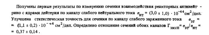 Получены первые результаты по измерению сечения взаимодействия реакторных антинейг -рино с ядрами дейтерия по каналу слабого нейтрального тока σΗΤ = (3,0 ± 1,0) · 10~44см2/дел. Улучшена статистическая точность для сечения по каналу слабого заряженного тока σ ~ * (1,1 ± 0,2) -10 см /дел. Определено отношение сечений обоих каналов Гэксп= <*3Τ/σΗΤ = = 0,37 ± 0,14 .