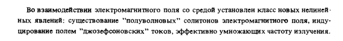 Во взаимодействии электромагнитного поля со средой установлен класс новых нелинейных явлений: существование "полуволновых" солитонов электромагнитного поля, индуцирование полем "джозефсоновских" токов, эффективно умножающих частоту излучения.