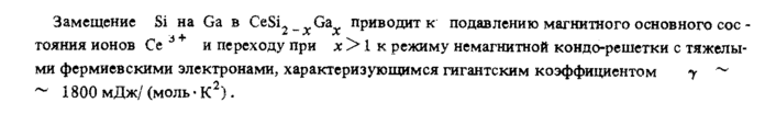 Замещение Si на Ga в CeSi^^Ga^. приводит к подавлению магнитного основного сое -тояния ионов Се л + и переходу при χ > 1 к режиму немагнитной кондо-решетки с тяжелыми фермиевскими электронами, характеризующимся гигантским коэффициентом у '"ч" ~ 1800 мДж/ (моль · К2) .