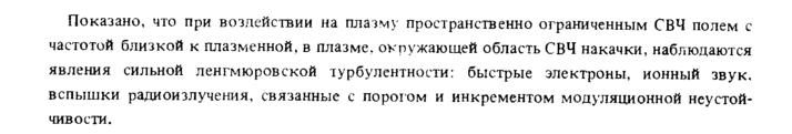 Показано, что при воздействии на плазму пространственно ограниченным СВЧ полем с частотой близкой к плазменной, в плазме, окружающей область СВЧ накачки, наблюдаются явления сильной ленгмюровской турбулентности: быстрые электроны, ионный звук, вспышки радиоизлучения, связанные с порогом и инкрементом модуляционной неустойчивости.