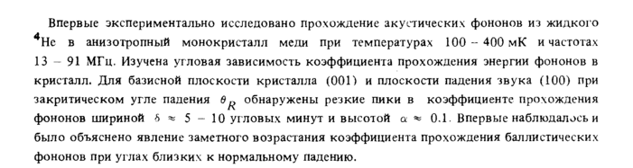 Впервые экспериментально исследовано прохождение акустических фононов из жидкого А Не в анизотропный монокристалл меди при температурах 100 400 мК и частотах 13-91 МГц, Изучена угловая зависимость коэффициента прохождения энергии фононов в кристалл. Для базисной плоскости кристалла (001) и плоскости падения звука (100) при закритическом угле падения θ^ обнаружены резкие пики в коэффициенте прохождения фононов шириной 6 ^ 5 — 10 угловых минут и высотой а * 0.1. Впервые наблюдалось и было объяснено явление заметного возрастания коэффициента прохождения баллистических фононов при углах близких к нормальному падению.