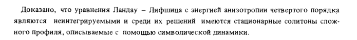 Доказано, что уравнения Ландау Лифшица с энергией анизотропии четвертого порядка являются неинтегрируемыми и среди их решений имеются стационарные солитоны сложного профиля, описываемые с помощью символической динамики.