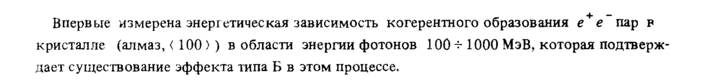Впервые измерена энергетическая зависимость когерентного образования е +е пар ρ кристалле (алмаз, < 100 > ) в области энергии фотонов 100 1000 МэВ, которая подтверждает существование эффекта типа Б в этом процессе.