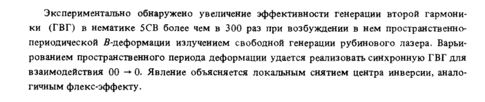 Экспериментально обнаружено увеличение эффективности генерации второй гармоники (ГВГ) в нематике 5СВ более чем в 300 раз при возбуждении в нем пространственно-периодической 5-деформации излучением свободной генерации рубинового лазера. Варьированием пространственного периода деформации удается реализовать синхронную ГВГ для взаимодействия 00 -»· 0. Явление объясняется локальным снятием центра инверсии, аналогичным флекс-эффекту.