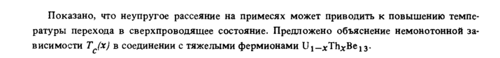 Показано, что неупругое рассеяние на примесях может приводить к повышению температуры перехода в сверхпроводящее состояние. Предложено объяснение немонотонной зависимости Τ (х) в соединении с тяжелыми фермионами U j-χΤη^Ββχз.