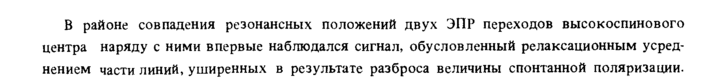 В районе совпадения резонансных положений двух ЭПР переходов высокоспинового центра наряду с ними впервые наблюдался сигнал, обусловленный релаксационным усреднением части линий, уширенных в результате разброса величины спонтанной поляризации.