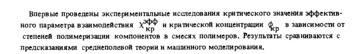 Впервые проведены экспериментальные исследования критического значения эффективного параметра взаимодействия )С*£^) и критической концентрации ώ в зависимости от кр степеней полимеризации компонентов в смесях полимеров. Результаты сравниваются с предсказаниями среднеполевой теории и машинного моделирования.
