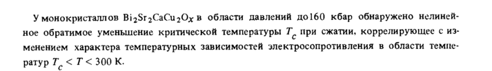 У монокристаллов Bi2Sr2CaCu20x в области давлений до160 кбар обнаружено нелинейное обратимое уменьшение критической температуры Т£ при сжатии, коррелирующее с изменением характера температурных зависимостей электросопротивления в области температур тс < Т< 300 К.