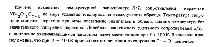 Изучено изменение температурной зависимости R(T) сопротивления керамики ^а2^из^7 ~х по мере Удаления кислорода из исследуемого образца. Температура сверхпроводящего перехода при этом постепенно сдвигалась в область низких температур без значительного уширения перехода. Линейная зависимость удельного сопротивления р(Т) с постепенно увеличивающимся наклоном имеет место только при Т> 400 К. Высказано предположение, что при Τ * 400 К происходит конденсация кислорода на Си О цепочках.