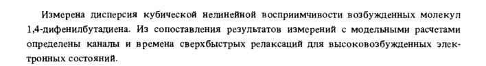 Измерена дисперсия кубической нелинейной восприимчивости возбужденных молекул 1,4-дифенилбутадиена. Из сопоставления результатов измерений с модельными расчетами определены каналы и времена сверхбыстрых релаксаций для высоковозбужденных электронных состояний.