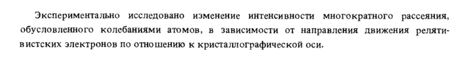 Экспериментально исследовано изменение интенсивности многократного рассеяния, обусловленного колебаниями атомов, в зависимости от направления движения релятивистских электронов по отношению к кристаллографической оси.