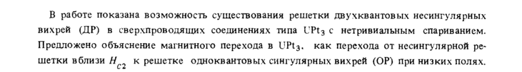 В работе показана возможность существования решетки двухквантовых несингулярных вихрей (ДР) в сверхпроводящих соединениях типа UPt3 с нетривиальным спариванием. Предложено объяснение магнитного перехода в UPt3. как перехода от несингулярной решетки вблизи Η к решетке одноквантовых сингулярных вихрей (ОР) при низких полях.