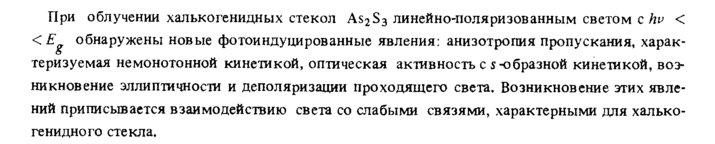 При облучении халькогенидных стекол AS2S3 линейно-поляризованным светом с hv < <Е обнаружены новые фотоиндуцированные явления: анизотропия пропускания, харак- о теризуемая немонотонной кинетикой, оптическая активность с s образной кинетикой, возникновение эллиптичности и деполяризации проходящего света. Возникновение этих явлений приписывается взаимодействию света со слабыми связями, характерными для халько-генидного стекла.