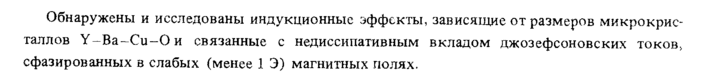 Обнаружены и исследованы индукционные эффекты, зависящие от размеров микрокристаллов Y-Ba-Cu-Ои связанные с недиссипативным вкладом джозефсоновских токов> сфазированных в слабых (менее 1 Э) магнитных полях.