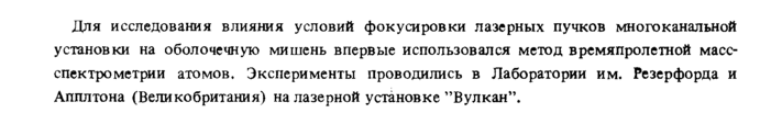 Для исследования влияния условий фокусировки лазерных пучков многоканальной установки на обол очечную мишень впервые использовался метод врсмяпролетной масс-спектрометрии атомов. Эксперименты проводились в Лаборатории им. Резерфорда и Апплтона (Великобритания) на лазерной установке "Вулкан".