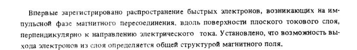 Впервые зарегистрировано распространение быстрых электронов, возникающих на импульсной фазе магнитного пересоединения, вдоль поверхности плоского токового слоя, перпендикулярно к направлению электрического тока. Установлено, что возможность выхода электронов из слоя определяется общей структурой магнитного поля.