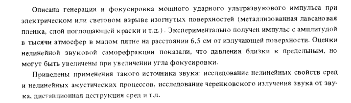 Описана генерация и фокусировка мощного ударного ультразвукового импульса при электрическом или световом взрыве изогнутых поверхностей (мсталлизованная лавсановая пленка, слой поглощающей краски и т.д.). Экспериментально получен импульс с амплитудой в тысячи атмосфер в малом пятне на расстоянии 6,5 см от излучающей поверхности. Оценки нелинейной звуковой саморефракции показали, что давления близки к предельным, но могут быть увеличены при увеличении угла фокусировки. Приведены применения такого источника звука: исследование нелинейных свойств сред и нелинейных акустических процессов, исследование черенковского излучения звука от звука, дистанционная деструкция сред и т.д.