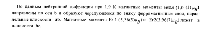 По данным нейтронной дифракции при 1,9 К магнитные моменты меди (1,0 (Ι)μ^) направлены по оси b и образуют чередующиеся по знаку ферромагнитные слои, параллельные плоскости ab. Магнитные моменты Er 1 (5,36(5)μ^) и Ег2(3,96(7)дд) лежат в плоскости be.