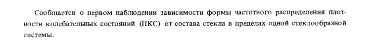 Сообщается о первом наблюдении зависимости формы частотного распределения плотности колебательных состояний (ПКС) от состава стекла в пределах одной стеклообразной системы.