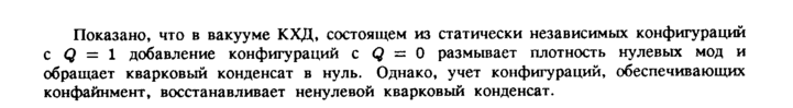 Показано, что в вакууме КХД, состоящем из статически независимых конфигураций с Q = ι добавление конфигураций с Q = 0 размывает плотность нулевых мод и обращает кварковый конденсат в нуль. Однако, учет конфигураций, обеспечивающих конфайнмент, восстанавливает ненулевой кварковый конденсат.