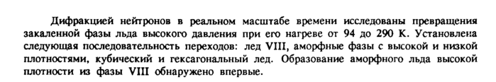 Дифракцией нейтронов в реальном масштабе времени исследованы превращения закаленной фазы льда высокого давления при его нагреве от 94 до 290 К. Установлена следующая последовательность переходов: лед VIII, аморфные фазы с высокой и низкой плотностями, кубический и гексагональный лед. Образование аморфного льда высокой плотности из фазы VIII обнаружено впервые.