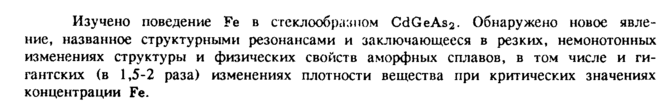 Изучено поведение Fe в стеклообразном CdGeAs2. Обнаружено новое явление, названное структурными резонансами и заключающееся в резких, немонотонных изменениях структуры и физических свойств аморфных сплавов, в том числе и гигантских (в 1,5-2 раза) изменениях плотности вещества при критических значениях концентрации Fe.