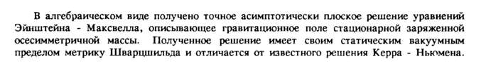 В алгебраическом виде получено точное асимптотически плоское решение уравнений Эйнштейна Максвелла, описывающее гравитационное поле стационарной заряженной осесимметричной массы. Полученное решение имеет своим статическим вакуумным пределом метрику Шварцшильда и отличается от известного решения Керра Ньюмена.