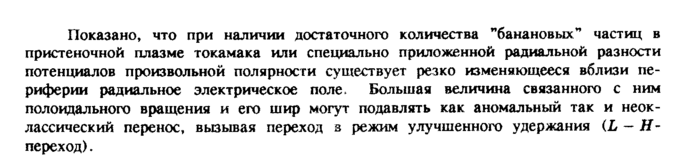 Показано, что при наличии достаточного количества "банановых*' частиц в пристеночной плазме токамака или специально приложенной радиальной разности потенциалов произвольной полярности существует резко изменяющееся вблизи периферии радиальное электрическое поле. Большая величина связанного с ним полоидального вращения и его шир могут подавлять как аномальный так и неоклассический перенос, вызывая переход в режим улучшенного удержания (L — Н-переход).