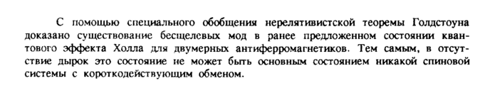С помощью специального обобщения нерелятивистской теоремы Голдстоуна доказано существование бесщелевых мод в ранее предложенном состоянии квантового эффекта Холла для двумерных антиферромагнетиков. Тем самым, в отсутствие дырок это состояние не может быть основным состоянием никакой спиновой системы с короткодействующим обменом.