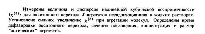 Измерены величина и дисперсия нелинейной кубической восприимчивости (χ(3)) для экситонного перехода J-агрегатов псевдоизоцианина в жидких растворах. Установлено сильное увеличение χ(3' при агрегации молекул. Определены время дефазировки экситонного перехода, сечение поглощения, концентрация и размер "оптических" агрегатов.