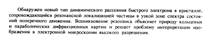 Обнаружен новый тип динамического рассеяния быстрого электрона в кристалле, сопровождающийся резонансной локализацией частицы в узкой зоне спектра состояний поперечного движения. Возникновение резонанса объясняет природу кольцевых и параболических дифракционных картин и решает проблему интерпретации изображения в электронной микроскопии высокого разрешения.