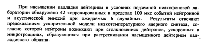 При насыщении палладия дейтерием в условиях подземной низкофоновой лаборатории обнаружено 42 коррелированных в пределах 100 мкс событий нейтронной и акустической эмиссий при ожидаемых 6 случайных. Результаты отвечают предсказаниям ускорительной модели низкотемпературного ядерного синтеза, согласно которой нейтроны возникают при столкновениях дейтронов, ускоренных в микротрещинах, образующихся при растрескивании насыщенного дейтерием пал-ладиевого образца.