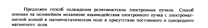 Предложен способ охлаждения релятивистских электронных пучков. Способ основан на нелинейном механизме взаимодействия электронного пучка с электромагнитной волной в магнитостатическом поле в присутствии постоянного и однородного магнитного поля.