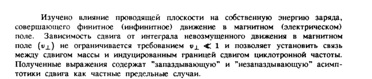 Изучено влияние проводящей плоскости на собственную энергию заряда, совершающего финитное (инфинитное) движение в магнитном (электрическом) поле. Зависимость сдвига от интеграла невозмущенного движения в магнитном поле (v±) не ограничивается требованием ν χ <С 1 и позволяет установить связь между сдвигом массы и индуцированным границей сдвигом циклотронной частоты. Полученные выражения содержат "запаздывающую" и "незапаздывающую" асимптотики сдвига как частные предельные случаи.
