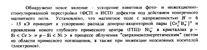 Обнаружено новое явление ускорение кинетики фотои инжекционно-стимулированной перестройки (ФСП и ИСП) дефектов под действием поперечного магнитного поля. Установлено, что магнитное поле с напряженностью Я = 6 15 кЭ приводит к ускорению распада донорно-акцепторной пары (Сг^В7)° и проявления нового глубокого примесного центра (ГПЦ) Ni7 » кристаллах ρ -Si < Cr > и ρ Si < Ni > в процессе облучения "сверхнизкоэнергетическим" светом из области примесного поглощения, а также при инжекции неосновных носителей (электронов).
