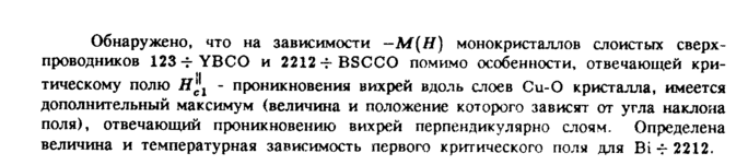 Обнаружено, что на зависимости -М(Н) монокристаллов слоистых сверхпроводников 123-=-YBCO и 2212-f BSCCO помимо особенности, отвечающей кри-тическому полю Н*х проникновения вихрей вдоль слоев Си-О кристалла, имеется дополнительный максимум (величина и положение которого зависят от угла наклона поля), отвечающий проникновению вихрей перпендикулярно слоям. Определена величина и температурная зависимость первого критического поля для Bi -f 2212.