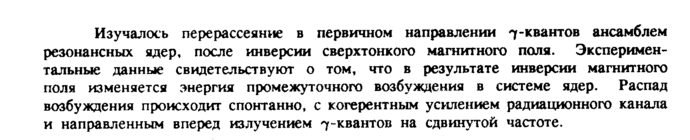 Изучалось перерассеяние в первичном направлении ^-квантов ансамблем резонансных ядер, после инверсии сверхтонкого магнитного поля. Экспериментальные данные свидетельствуют о том, что в результате инверсии магнитного поля изменяется энергия промежуточного возбуждения в системе ядер. Распад возбуждения происходит спонтанно, с когерентным усилением радиационного канала и направленным вперед излучением ^-квантов на сдвинутой частоте.