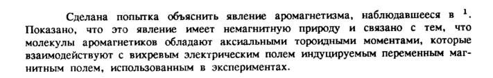 Сделана попытка объяснить явление аромагнетизма, наблюдавшееся в Показано, что это явление имеет немагнитную природу и связано с тем, что молекулы аромагнетиков обладают аксиальными тороидными моментами, которые взаимодействуют с вихревым электрическим полем индуцируемым переменным магнитным полем, использованным в экспериментах.