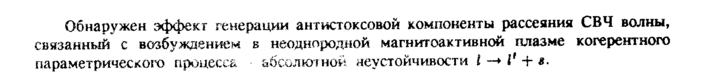 Обнаружен эффект генерации антистоксовой компоненты рассеяния СВЧ волны, связанный с возбуждением б неоднородной магнитоактивной плазме когерентного параметрического процесса абсолютной неустойчивости I —* V + «.