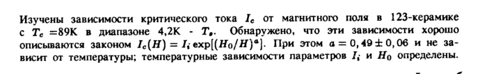 Изучены зависимости критического тока /с от магнитного поля в 123-керамике с Тс =89К в диапазоне 4,2К Г,. Обнаружено, что эти зависимости хорошо описываются законом IC{H) = U ехр[(Я0/Я)а]. При этом а = 0,49 ±0,06 и не зависит от температуры; температурные зависимости параметров /,· и Но определены.