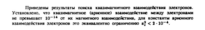 Приведены результаты поиска квазимагнитного взаимодействия электронов. Установлено, что квазимагнитное (арионное) взаимодействие между электронами не превышает Ю-1* от их магнитного взаимодействия, для константы арионного взаимодействия электронов это эквивалентно ограничению < 2 · 10*"4.