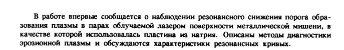 В работе впервые сообщается о наблюдении резонансного снижения порога образования плазмы в парах облучаемой лазером поверхности металлической мишени, в качестве которой использовалась пластина из натрия. Описаны методы диагностики эрозионной плазмы и обсуждаются характеристики резонансных кривых.