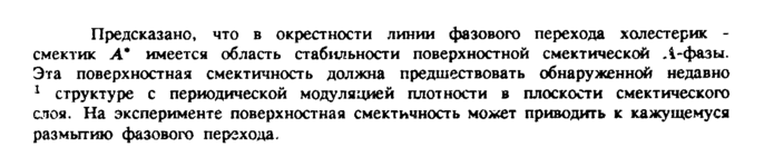 Предсказано, что в окрестности линии фазового перехода холестерик -смектик А* имеется область стабильности поверхностной смектической Л-фазы. Эта поверхностная смектичность должна предшествовать обнаруженной недавно 1 структуре с периодической модуляцией плотности в плоскости смектического слоя. На эксперименте поверхностная смектичность может приводить к кажущемуся размытию фазового перехода.