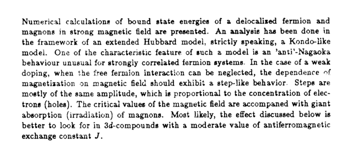 Numerical calculations of bound state energies of a delocalized fermion and magnons in strong magnetic field are presented. Ал analysis has been done in the framework of an extended Hubbard model, strictly speaking, a Kondo-like model. One of the characteristic feature of such a model is an 'anti'-Nagaoka behaviour unusual for strongly correlated fermion systems. In the case of a weak doping, when the free fermion interaction can be neglected, the dependence of magnetization on magnetic field should exhibit a step-like behaviorSteps are mostly of the same amplitude, which is proportional to the concentration of electrons (holes). The critical values of the magnetic field are accompaned with giant absorption (irradiation) of magnons. Most likely, the effect discussed below is better to look for in 3ci-compounde with a moderate value of antiferromagnetic exchange constant J.