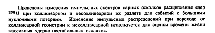 Проведены измерения импульсных спектров парных осколков расщепления ядер 2S8U при коллинеарном и неколлинеарном их разлете для событий с большими нуклонными потерями. Изменение импульсных распределений при переходе от коллинеарной геометрии к неколлинеарной используется для оценки времени жизни массивных ядерно-нестабильных осколков.
