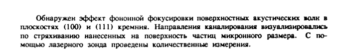 Обнаружен эффект фононной фокусировки поверхностных акустических волк в плоскостях (100) и (111) кремния. Направления каналирования визуализировались по стряхиванию нанесенных на поверхность частиц микронного размера. С помощью лазерного зонда проведены количественные измерения.