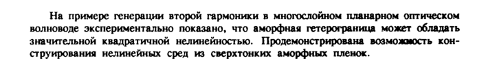 На примере генерации второй гармоники в многослойном пленарном оптическом волноводе экспериментально показано* что аморфная гетерограница может обладать значительной квадратичной нелинейностью. Продемонстрирована возможность конструирования нелинейных сред из сверхтонких аморфных пленок.