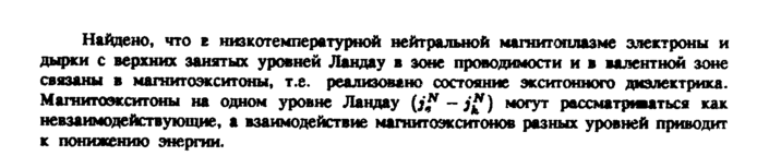 Найдено, что ε низкотемпературной нейтральной магнитоплазме электроны и дырки с верхних занятых уровней Ландау в зоне проводимости и в валентной зоне связаны в магнитоэкситоны, т.е. реализовано состояние экситонного диэлектрика. Магнитоэкситоны на одном уровне Ландау (/* jg) могут рассматриваться как невзаимодействующие, а взаимодействие магнитоэкситонов разных уровней приводит к понижению энергии.