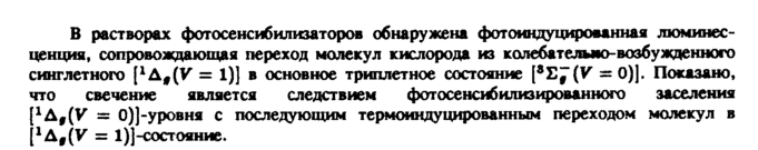 В растворах фотосенсибилизаторов обнаружена фотоиндуцированная люминесценция, сопровождающая переход молекул кислорода из колебательно-возбужденного синглетного [1Af {V = 1)] в основное триплетное состояние [SE~(V 0)]. Показано, что свечение является следствием фотосенсибилизированного заселения [1Δ,(V* — 0)]-уровня с последующим термоиндуцированным переходом молекул в [1Δ#(ν = 1)]-состояние.