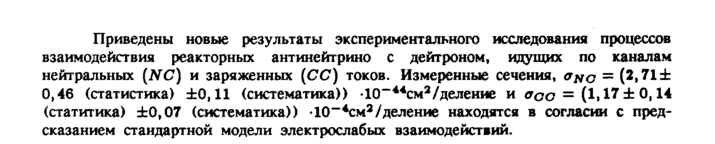 Приведены новые результаты экспериментального исследования процессов взаимодействия реакторных антинейтрино с дейтроном, идущих по каналам нейтральных {NC) и заряженных (СС) токов. Измеренные сечения, а^с = (2,71± 0,46 (статистика) ±0,11 (систематика)) 10 ~ "см2/деление и асе = (1· 17 ± 0,14 (статитика) ±0,07 (систематика)) · 10 ~4см3/деление находятся в согласии с предсказанием стандартной модели электрослабых взаимодействии.